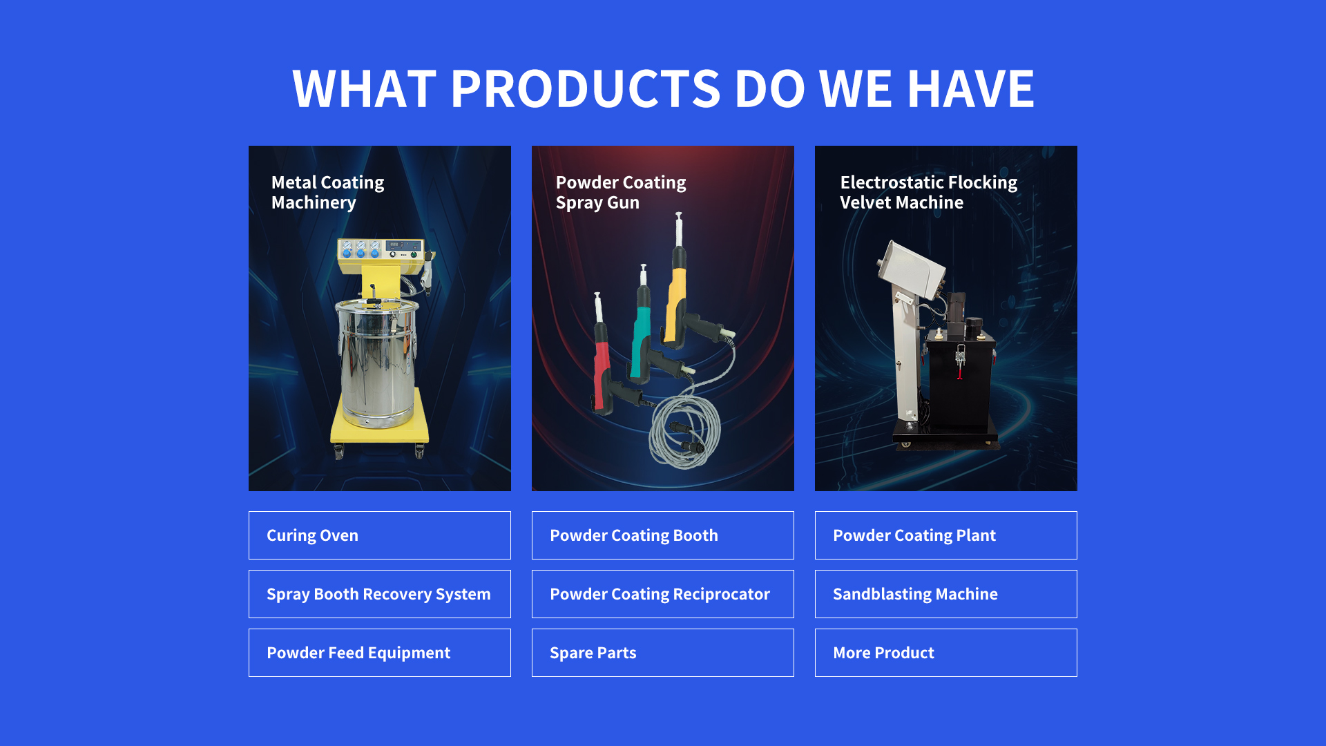 Application scenarios of Manual Powder Coating Lines Manual Powder Coating Lines Application: Small batch production, custom work, and prototyping.Features:Lower initial investment.High flexibility and adaptability.